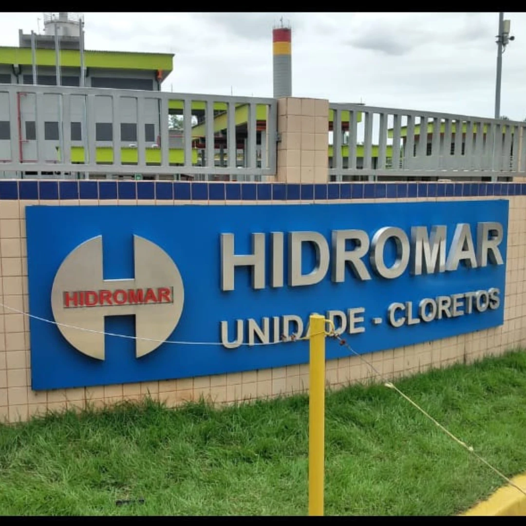 Industria Hidromar Logotipo Institucional de apresentação da empresa em letra caixa em aço inox. Solicitar Orçamento